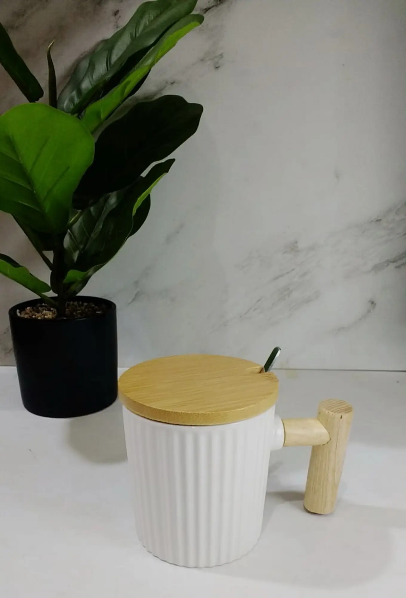 TAZA CERAMICA C/TAPA Y CUCHARA L/BAMBU