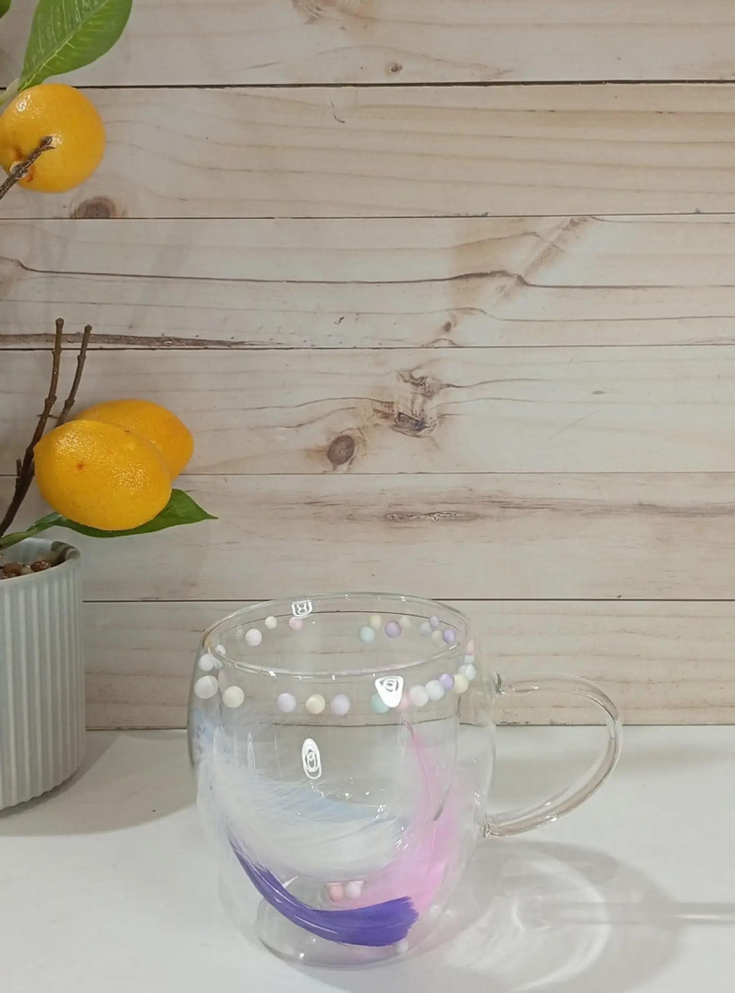 TAZA VIDRIO DOBLE C/ PLUMAS 250ML.